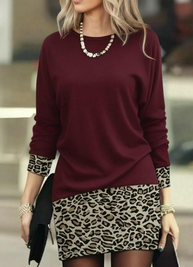 Uzun Kollu Bisiklet Yaka Üst Viskon Iki Iplik Alt Leopar Desenli Mini Elbise