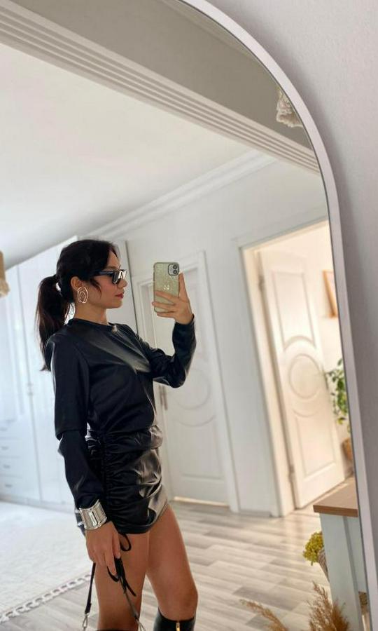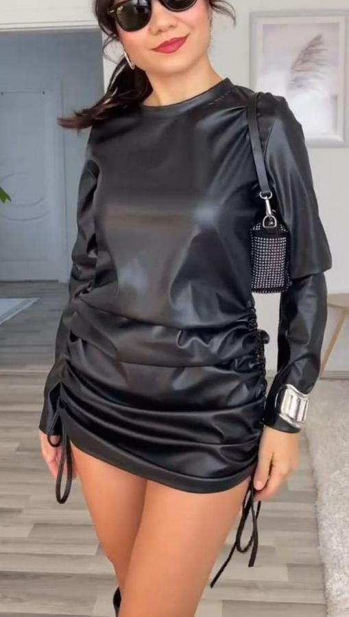 AnasayfaTüm ÜrünlerElbiseUzun Kollu Bisiklet Yaka Yandan Büzgülü Kısa Deri Elbise