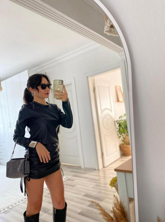 Uzun Kollu Bisiklet Yaka Yandan Büzgülü Kısa Deri Elbise