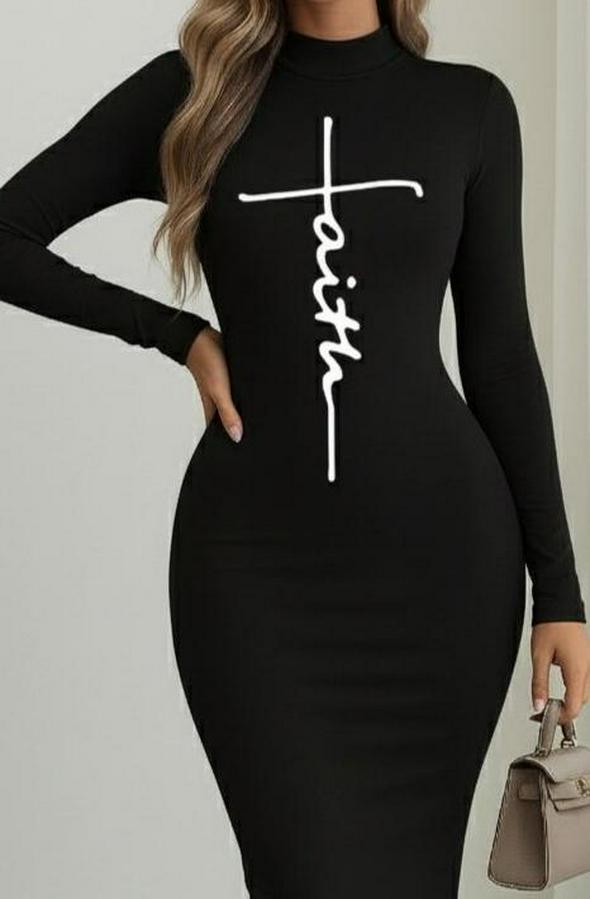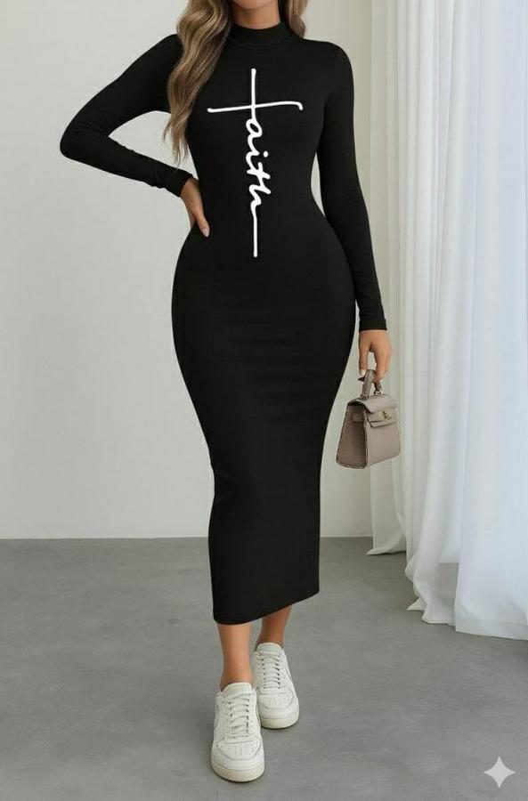 Kadın Uzun Kollu Boğazlı Baskı Detaylı Viskon Tam Boy Elbise