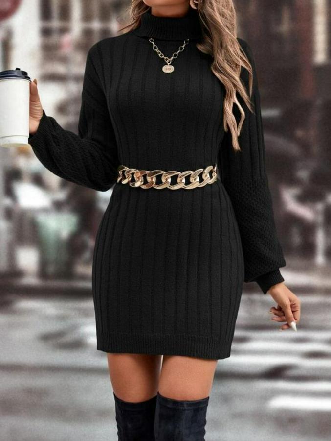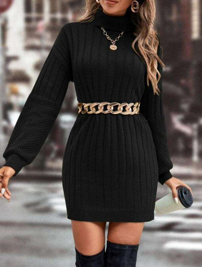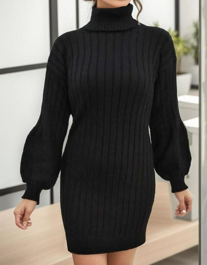 Kadın Uzun Kollu Boğazlı Uzun Balon Kol Triko Mini Elbise