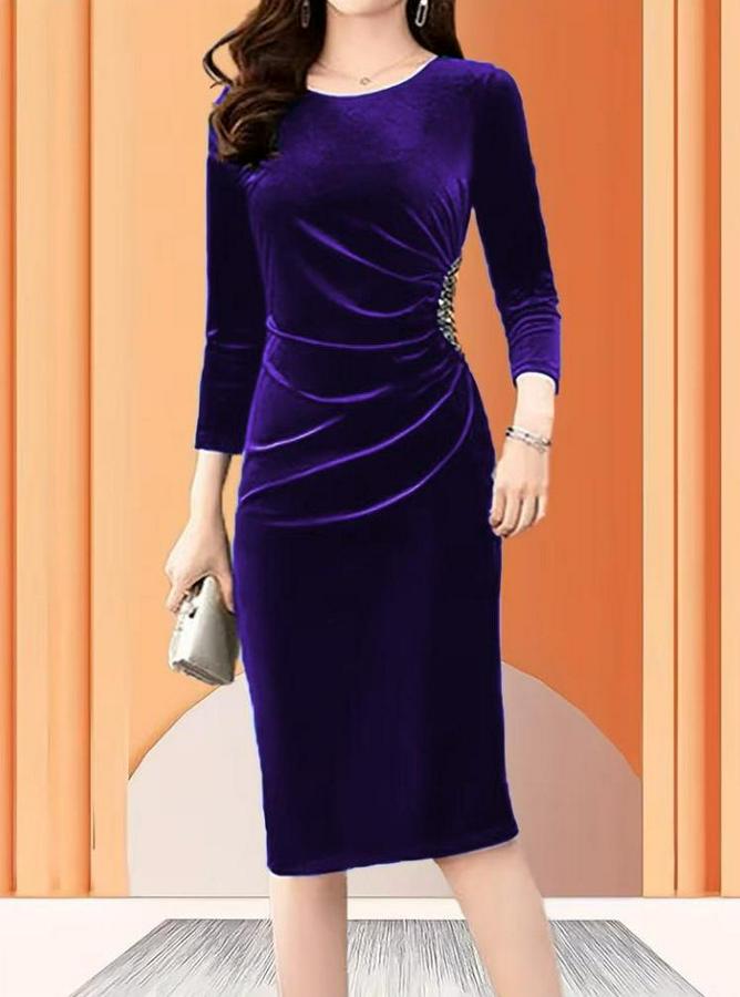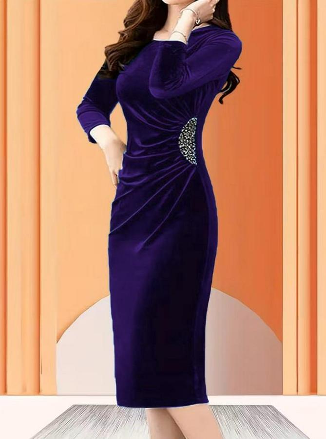 AnasayfaTüm ÜrünlerElbiseUzun Kollu Bot Yaka Yanı Taş Detaylı Midi Kadife Elbise