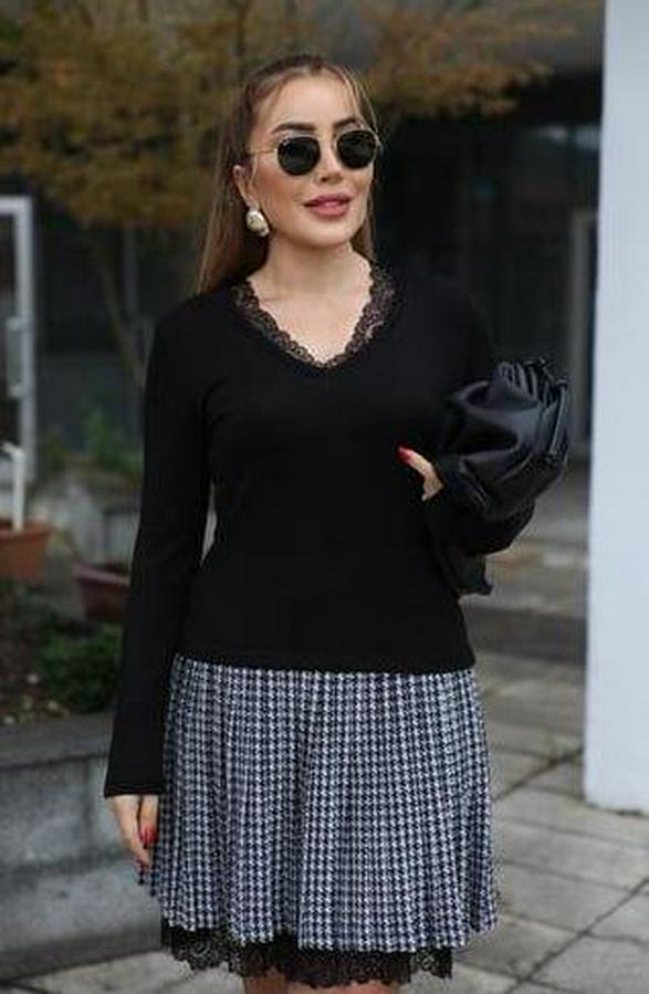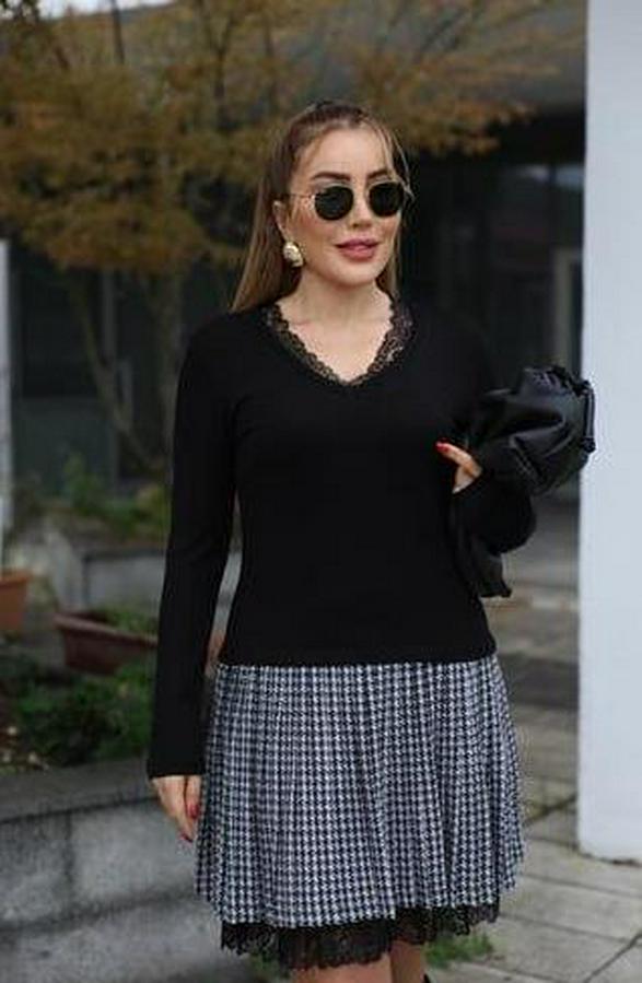 AnasayfaTüm ÜrünlerElbiseUzun Kollu Denteli Yaka Ekose Etek Detay Diz Üstü Elbise