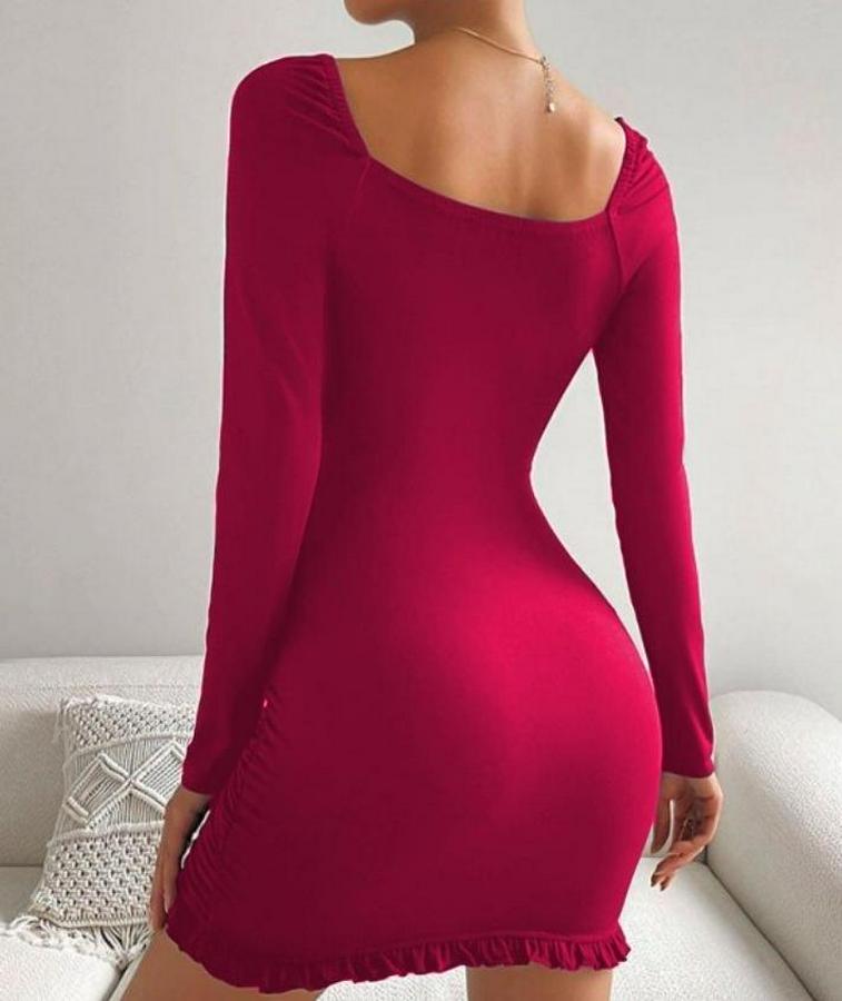 Kadın Uzun Kollu Derin V Yaka Göğüs Altı Dekolte Detay Etek Ucu Fırfırlı Sandy Mini Boy Elbise