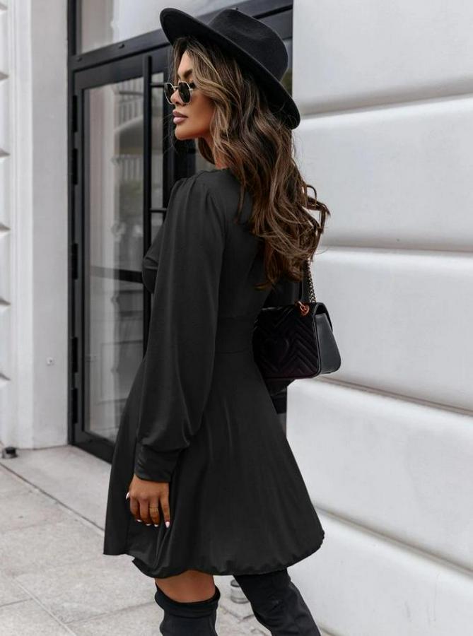 Kadın Uzun Kollu Derin V Yaka Göğüs Altı Dekolte Detaylı Sandy Mini Boy Elbise