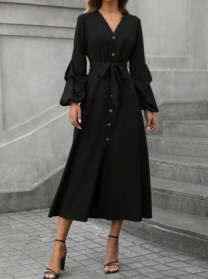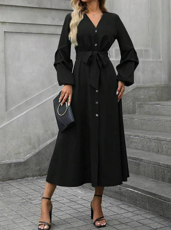 AnasayfaTüm ÜrünlerElbiseUzun Kollu Derin V Yakalı Belden Kuşaklı Önden Düğmeli Janjan Krep Elbise