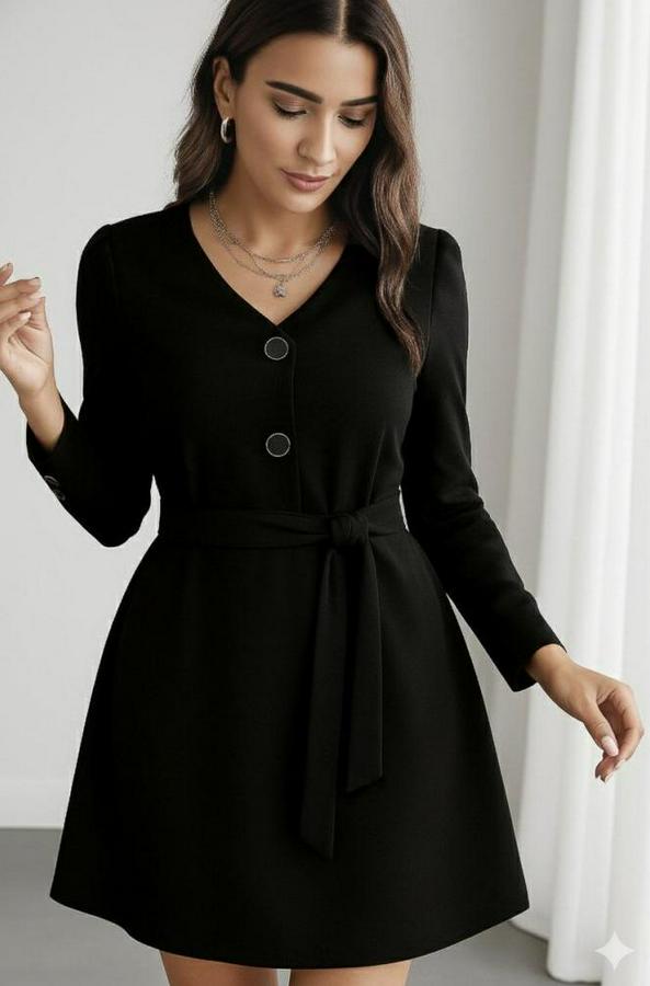 AnasayfaTüm ÜrünlerElbiseUzun Kollu Düğme Detaylı Kendinden Kemerli Ithal Krep Elbise