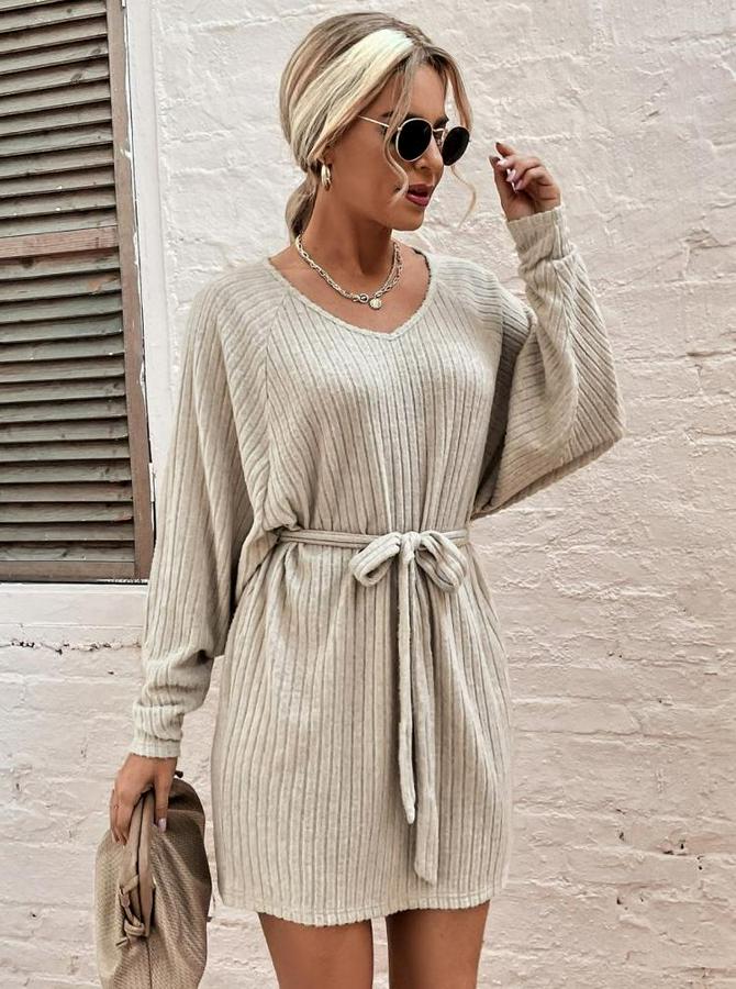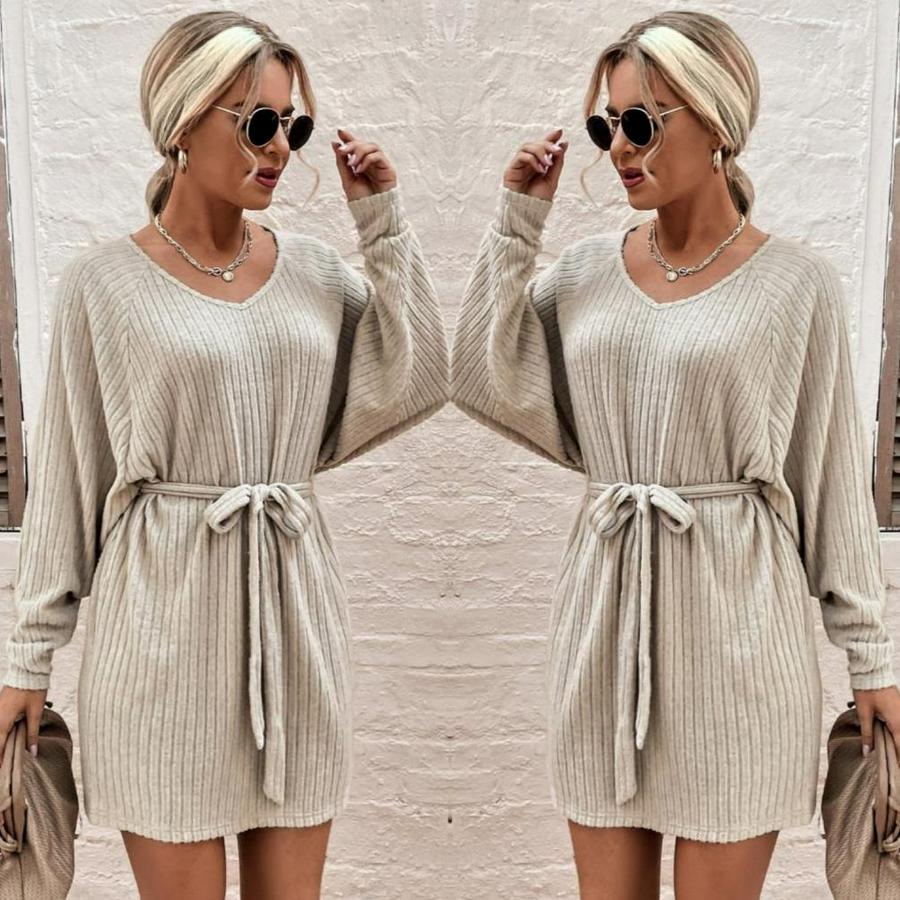 AnasayfaTüm ÜrünlerElbiseUzun Kollu Fitilli Şardonlu Detay Buklet Kuşaklı Yumoş Elbise