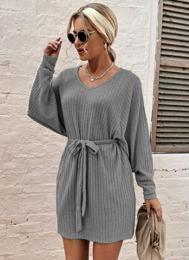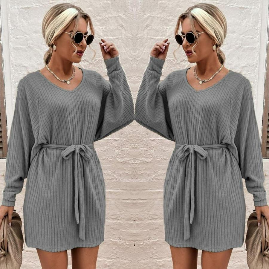 AnasayfaTüm ÜrünlerElbiseUzun Kollu Fitilli Şardonlu Detay Buklet Kuşaklı Yumoş Elbise