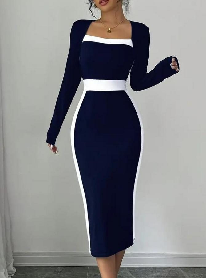 Kadın Uzun Kollu Geometrik Yaka Midi Ithal Krep Elbise