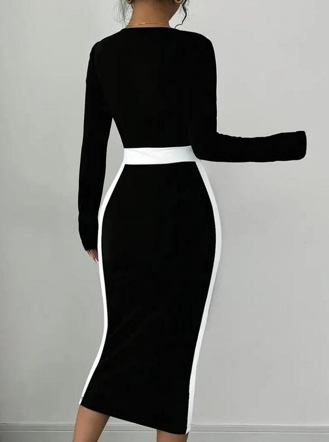 AnasayfaTüm ÜrünlerElbiseUzun Kollu Geometrik Yaka Midi Ithal Krep Elbise