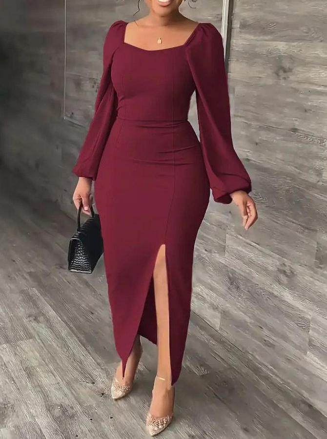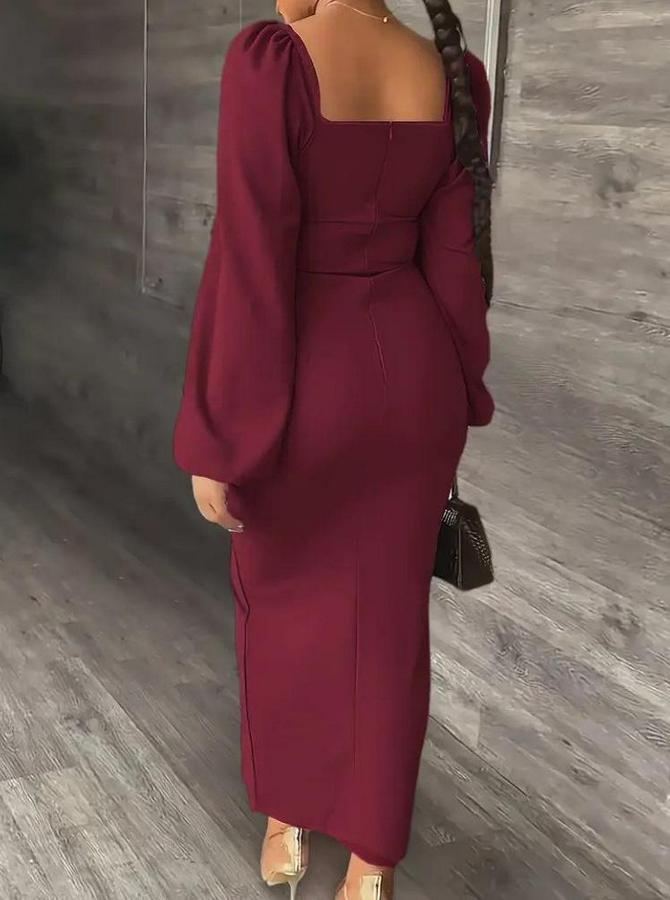 Kadın Uzun Kollu Geometrik Yakalı Yandan Yırtmaçlı Uzun Janjan Krep Elbise