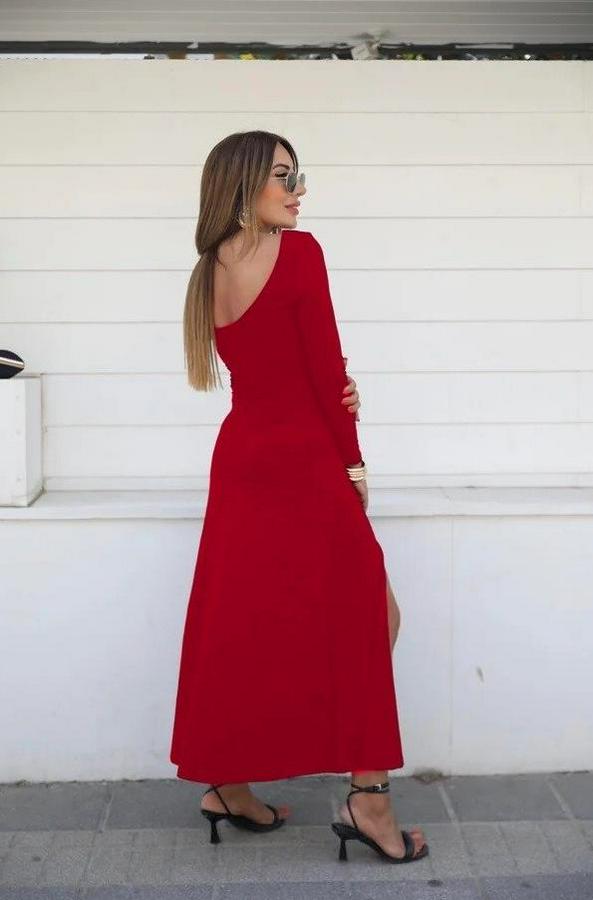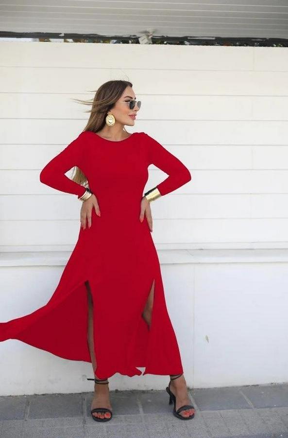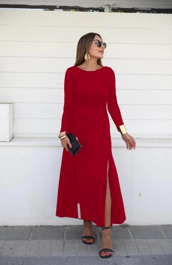 Kadın Uzun Kollu Hafif Kayık Yaka Sırt Dekolteli Yırtmaç Detaylı Viskon Tam Boy Elbise