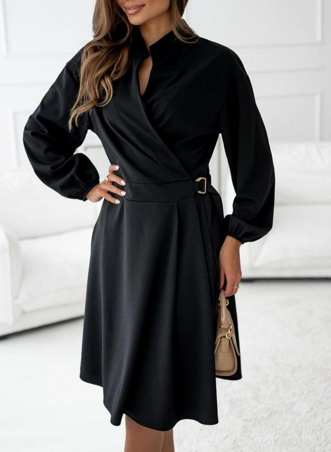 Kadın Uzun Kollu Hakim V Yakalı Yandan Toka Detaylı Ithal Mini Krep Elbise