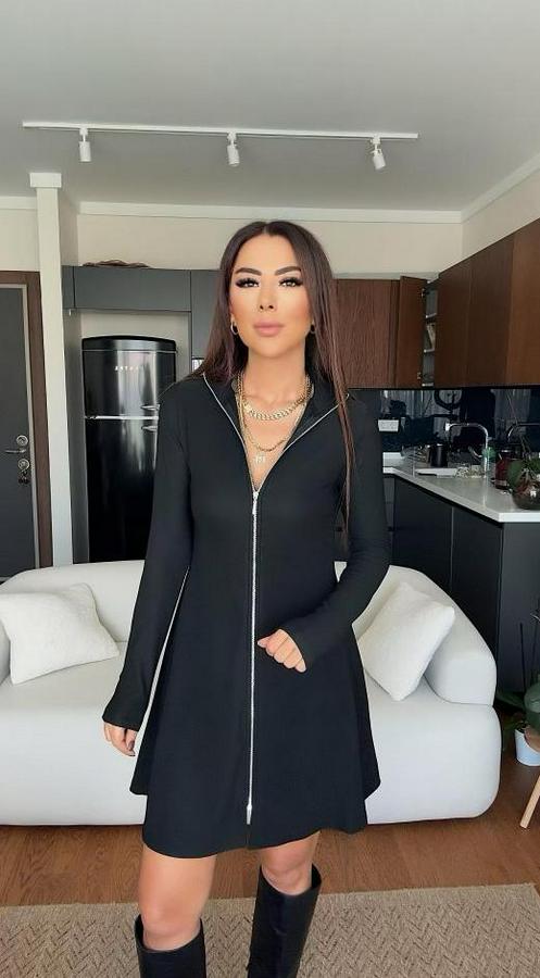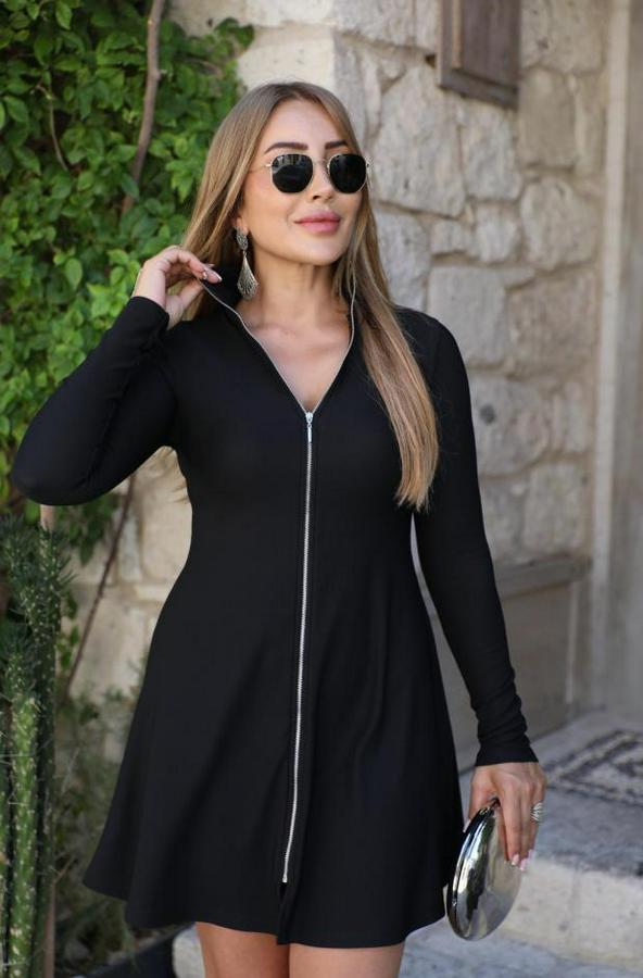 AnasayfaTüm ÜrünlerElbiseUzun Kollu Hakim Yaka Ayarlanabilir Fermuar Dekolteli Mini Elbise