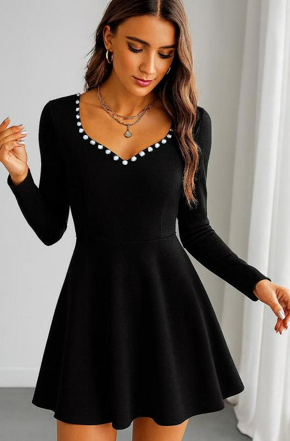 Uzun Kollu Inci Yakalı Kısa Ithal Krep Elbise