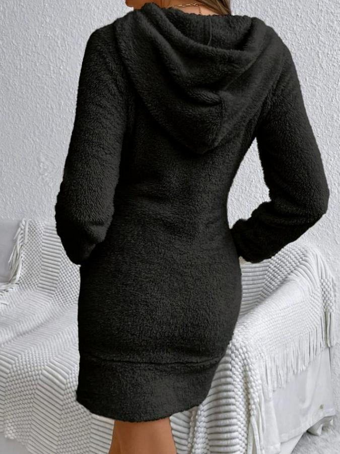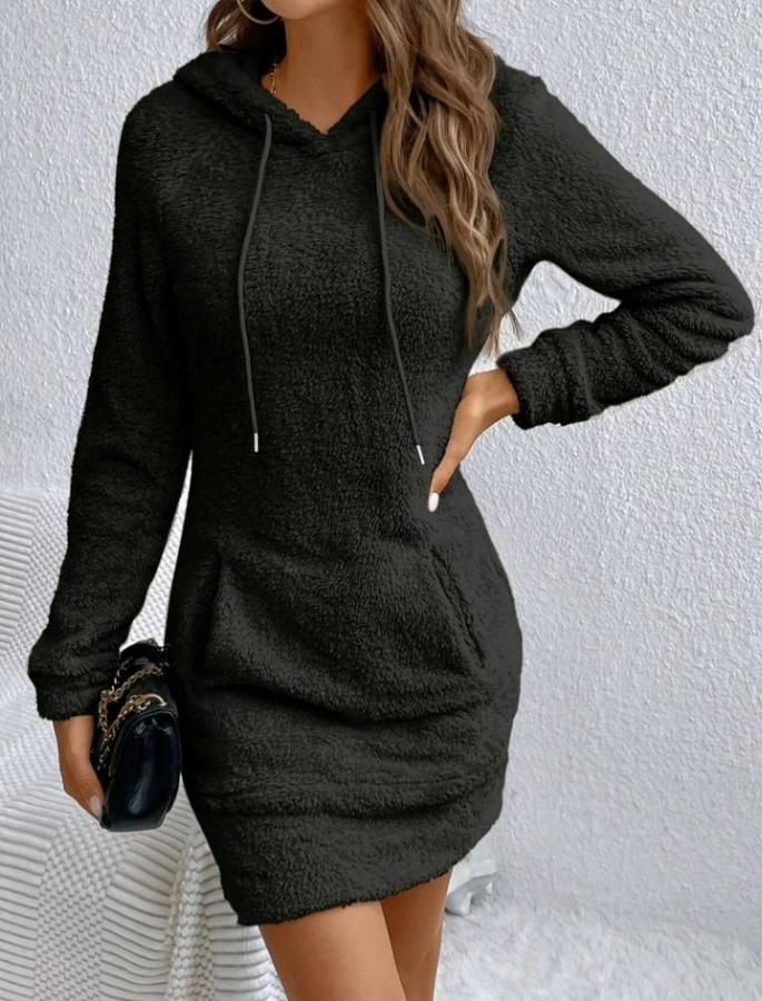 Uzun Kollu Kapşonlu Cepli Mini Peluş Elbise