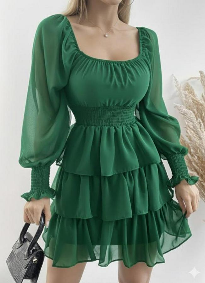 Uzun Kollu Kare Yaka Beli Lastikli Volanlı Şifon Elbise