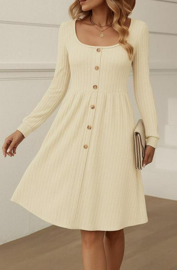 AnasayfaTüm ÜrünlerElbiseUzun Kollu Kare Yaka Düğmeli Kısa Şardonlu Iki Iplik Mini Elbise