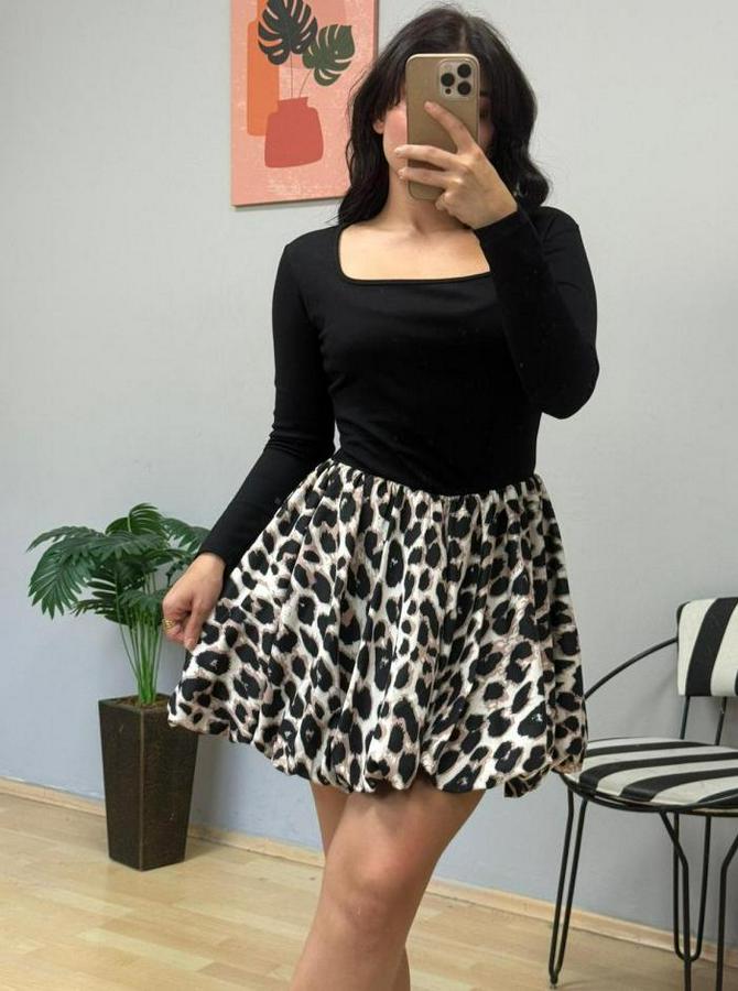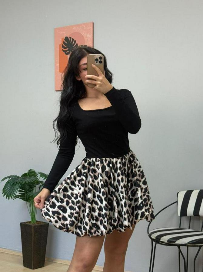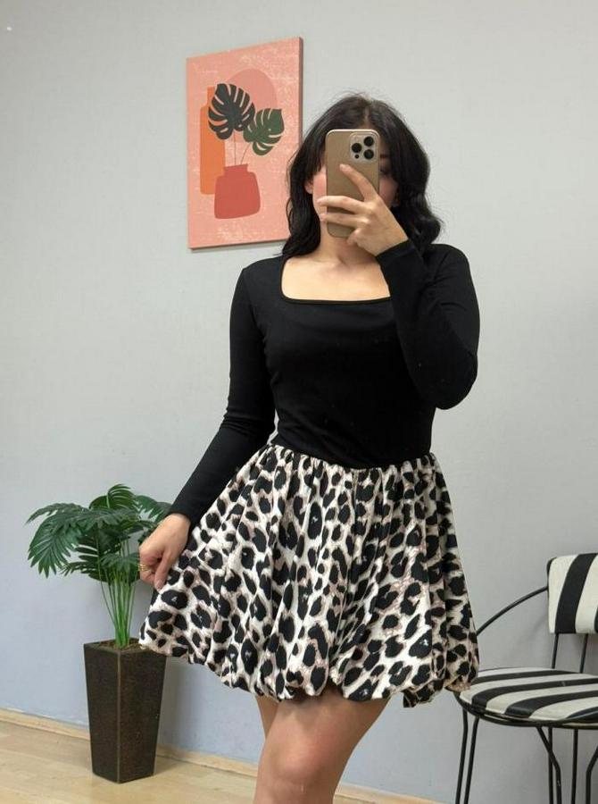 Uzun Kollu Kare Yaka Mini Balon Modal Elbise