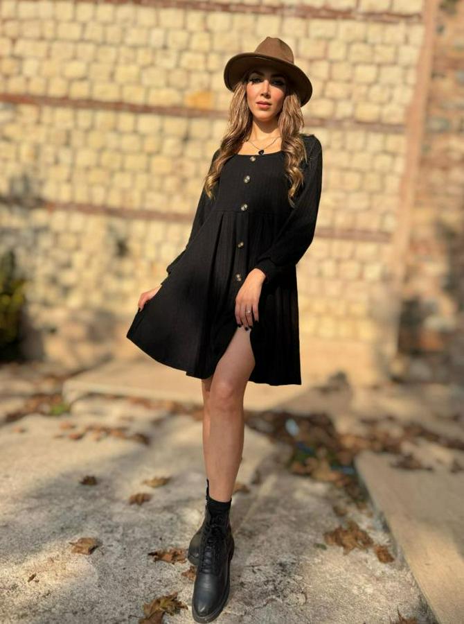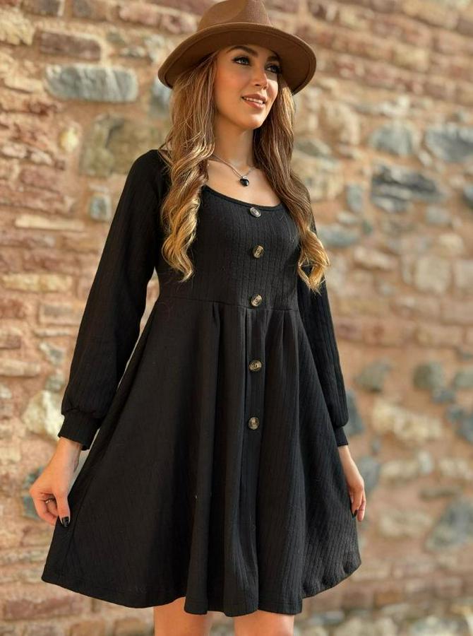 AnasayfaTüm ÜrünlerElbiseUzun Kollu Kare Yaka Önden Düğmeli Midi Şardonlu Kaşkorse Elbise
