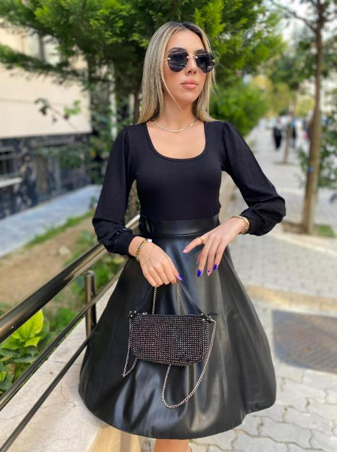 Kadın Uzun Kollu Kare Yaka üst Viskon Alt Deri Mini Elbise