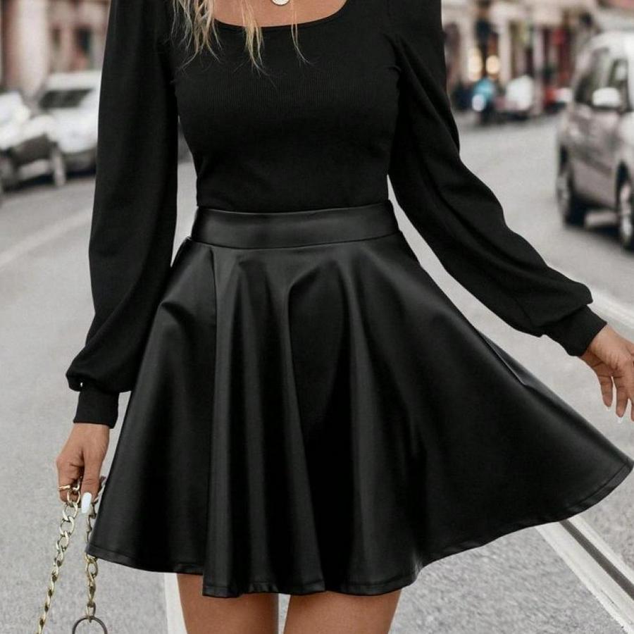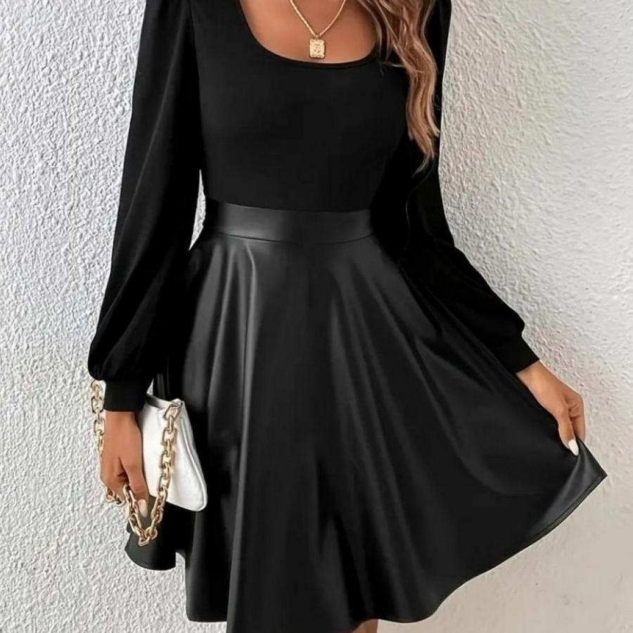 AnasayfaTüm ÜrünlerElbiseUzun Kollu Kare Yaka Üst Viskon Alt Deri Mini Elbise