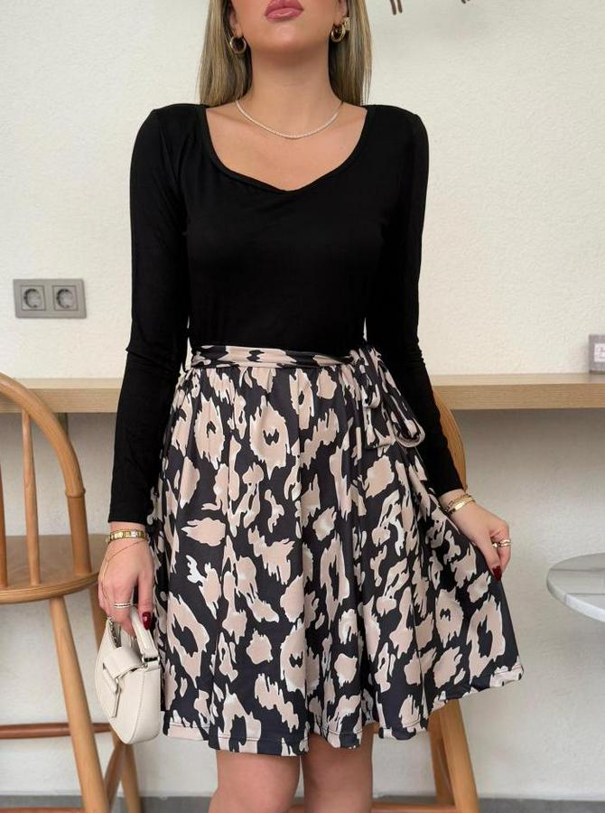 AnasayfaTüm ÜrünlerElbiseUzun Kollu Kare Yaka Viskon Bluz Alt Süprem Baskılı Belden Kuşaklı Kısa Elbise