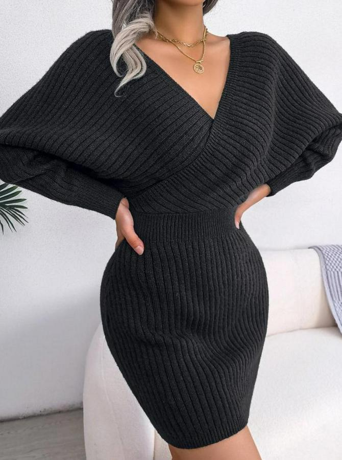 Uzun Kollu Kruvaze Geniş Yakalı Mini Triko Elbise