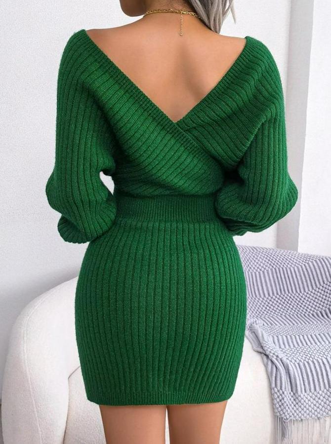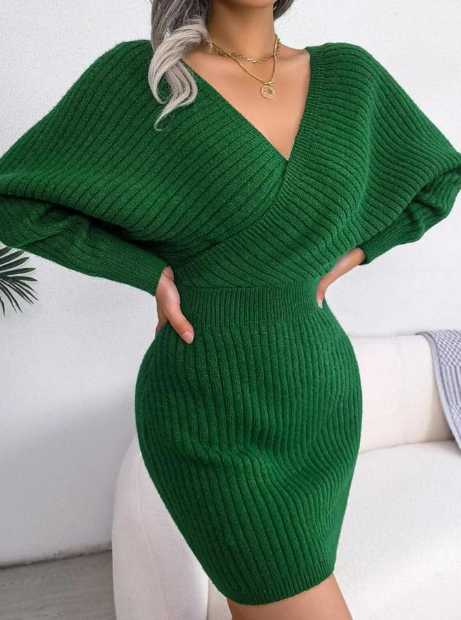 Uzun Kollu Kruvaze Geniş Yakalı Mini Triko Elbise