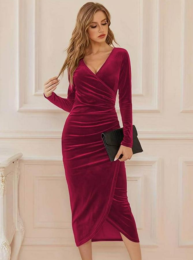 Uzun Kollu Kruvaze Yaka Belden Büzgü Detay Midi Kadife Elbise