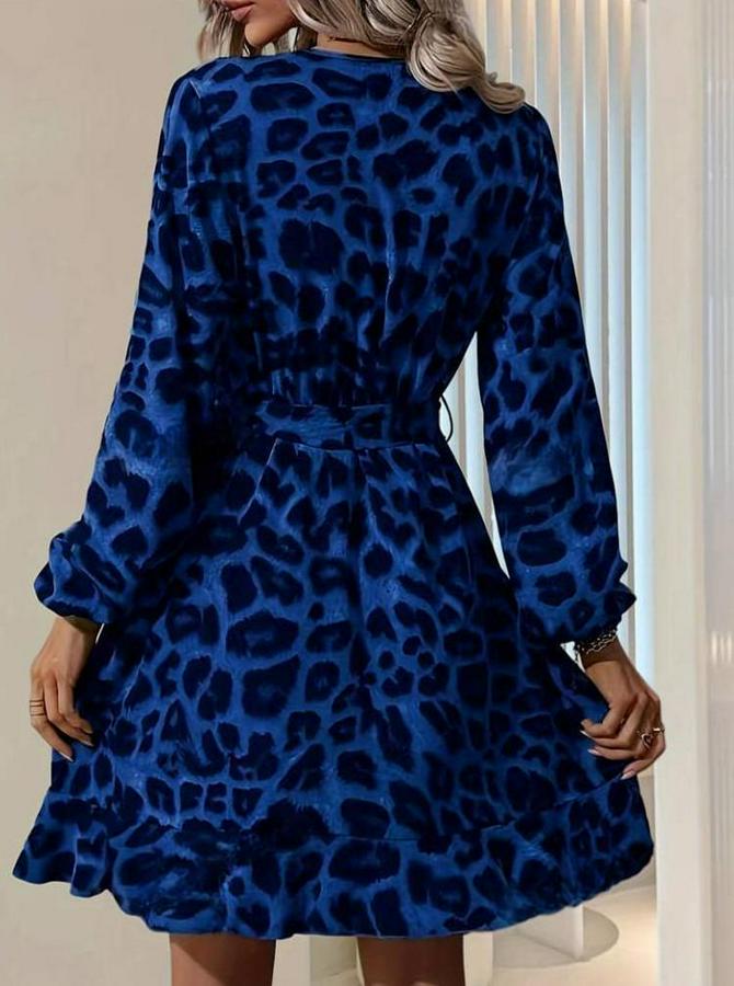 Uzun Kollu Kruvaze Yaka Belden Kuşaklı Çapraz Kesim Detaylı Leopar Modal Mini Elbise