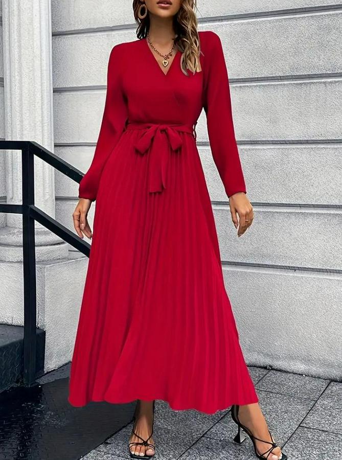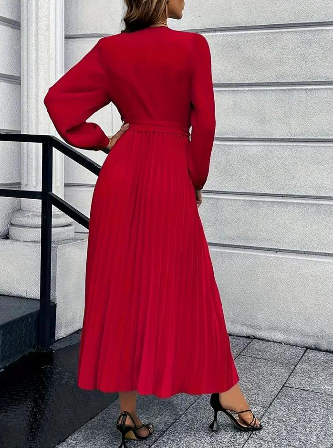 Uzun Kollu Kruvaze Yaka Belden Kuşaklı Pileli Ithal Krep Elbise