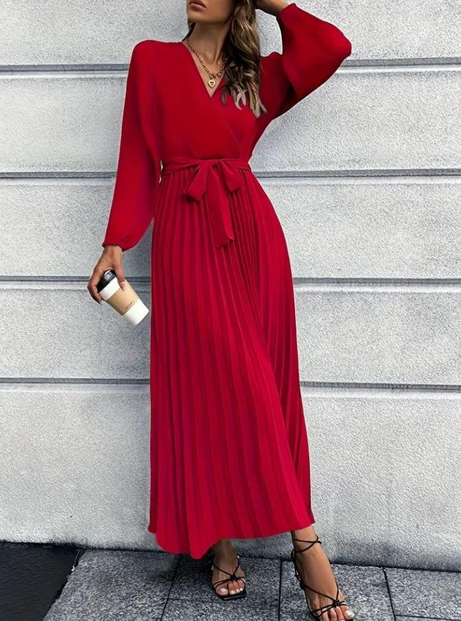 AnasayfaTüm ÜrünlerElbiseUzun Kollu Kruvaze Yaka Belden Kuşaklı Pileli Ithal Krep Elbise