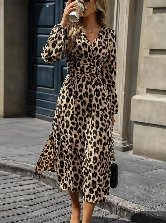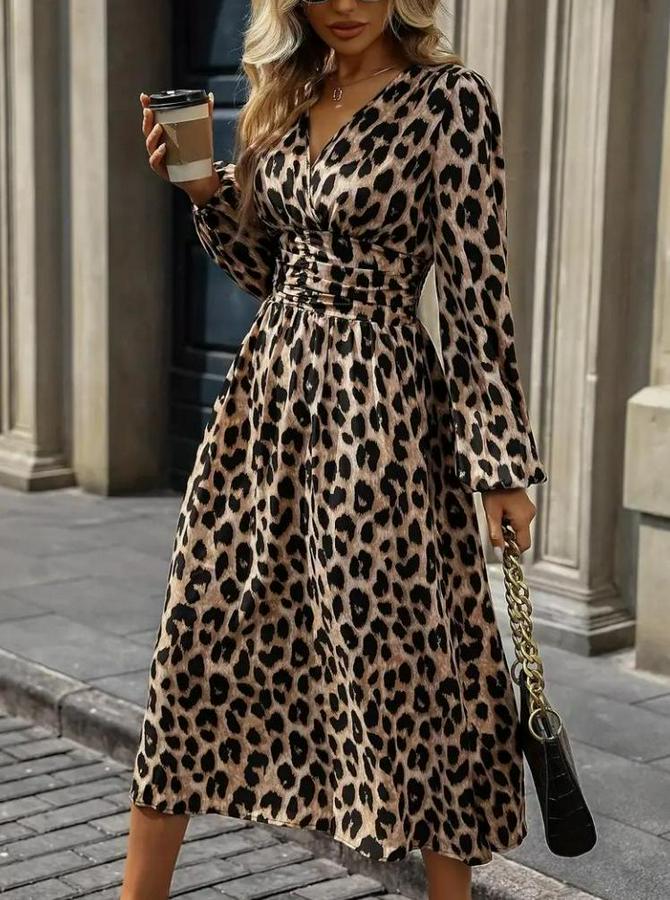 Uzun Kollu Kruvaze Yaka Belden Oturtmalı Midi Modal Leopar Desenli Elbise