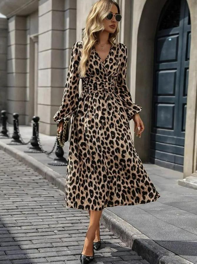 AnasayfaTüm ÜrünlerElbiseUzun Kollu Kruvaze Yaka Belden Oturtmalı Midi Modal Leopar Desenli Elbise
