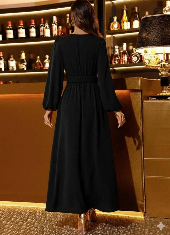 AnasayfaTüm ÜrünlerElbiseUzun Kollu Kruvaze Yaka Beli Kemerli Yırtmaçlı Uzun Ithal Krep Elbise