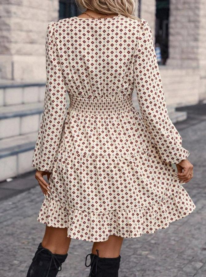 AnasayfaTüm ÜrünlerElbiseUzun Kollu Kruvaze Yaka Desenli Mini Modal Elbise