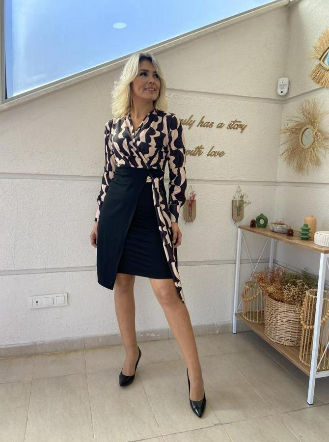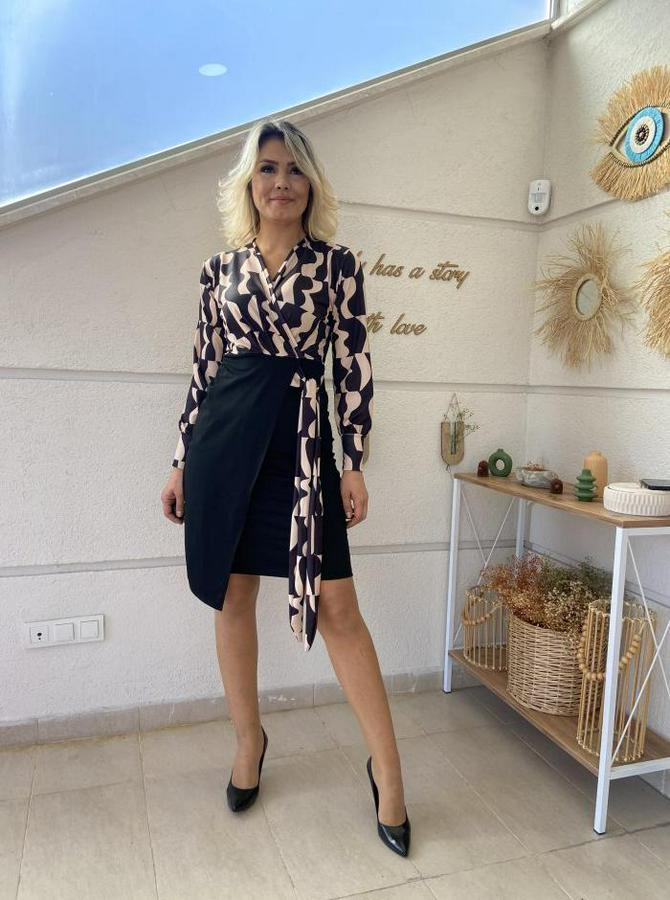 AnasayfaTüm ÜrünlerElbiseUzun Kollu Kruvaze Yaka Dijital Baskılı Fiyonk Detay Dalgıç Kumaş Elbise