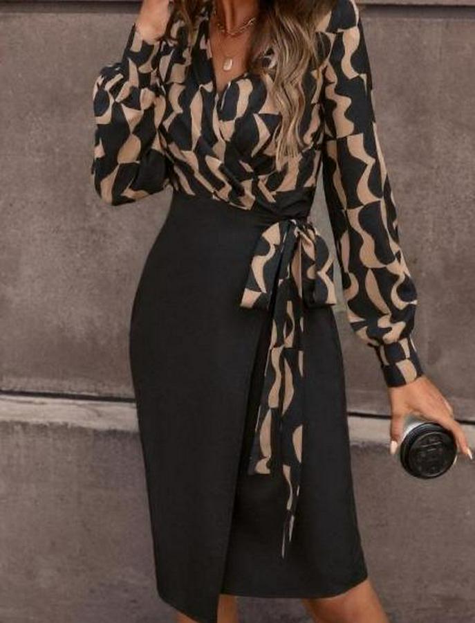 Uzun Kollu Kruvaze Yaka Dijital Baskılı Fiyonk Detay Dalgıç Kumaş Elbise