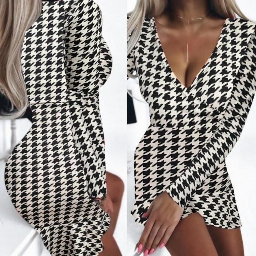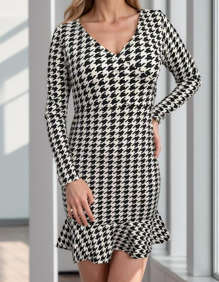 Uzun Kollu Kruvaze Yaka Kazayağı Mikro Mini Boy Elbise