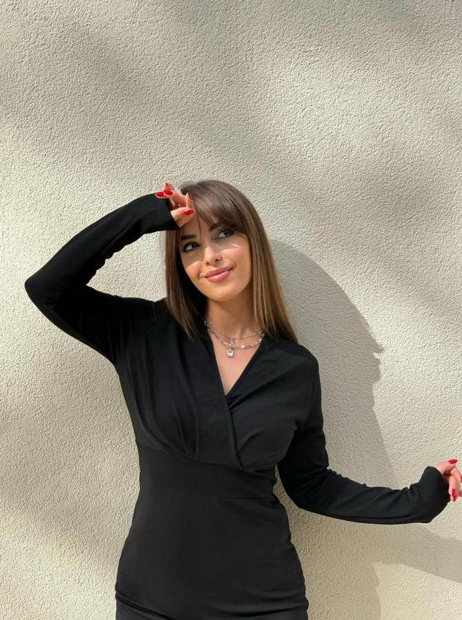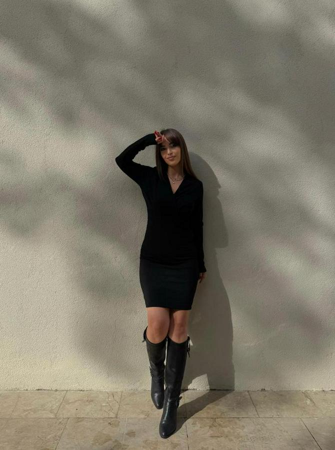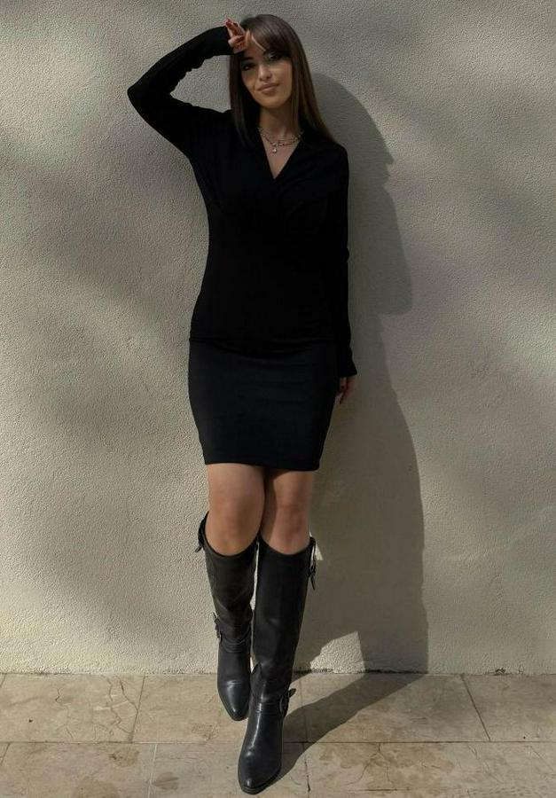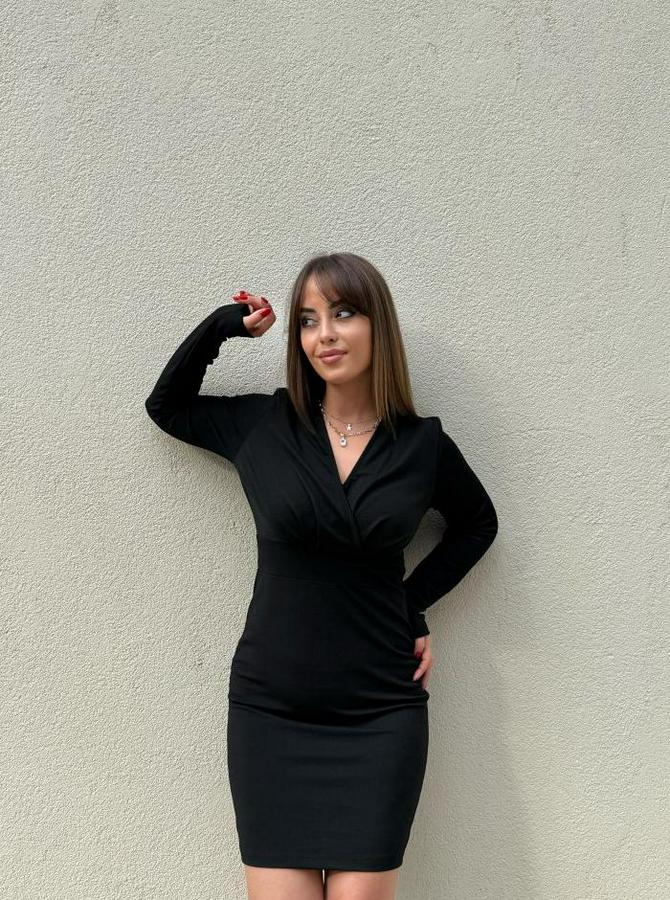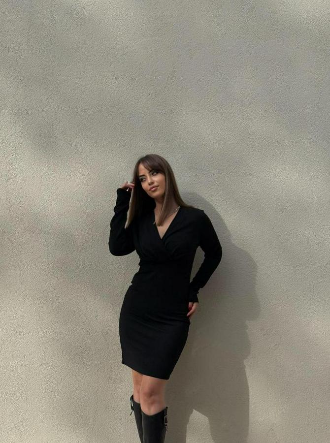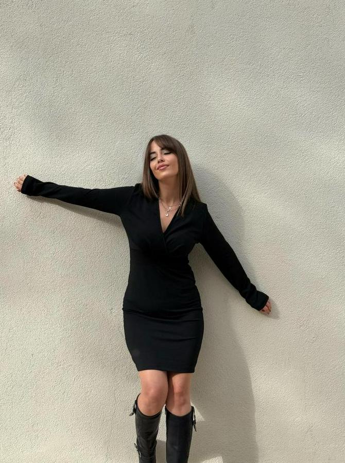 Uzun Kollu Kruvaze Yaka Krep Mini Boy Elbise