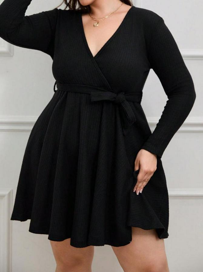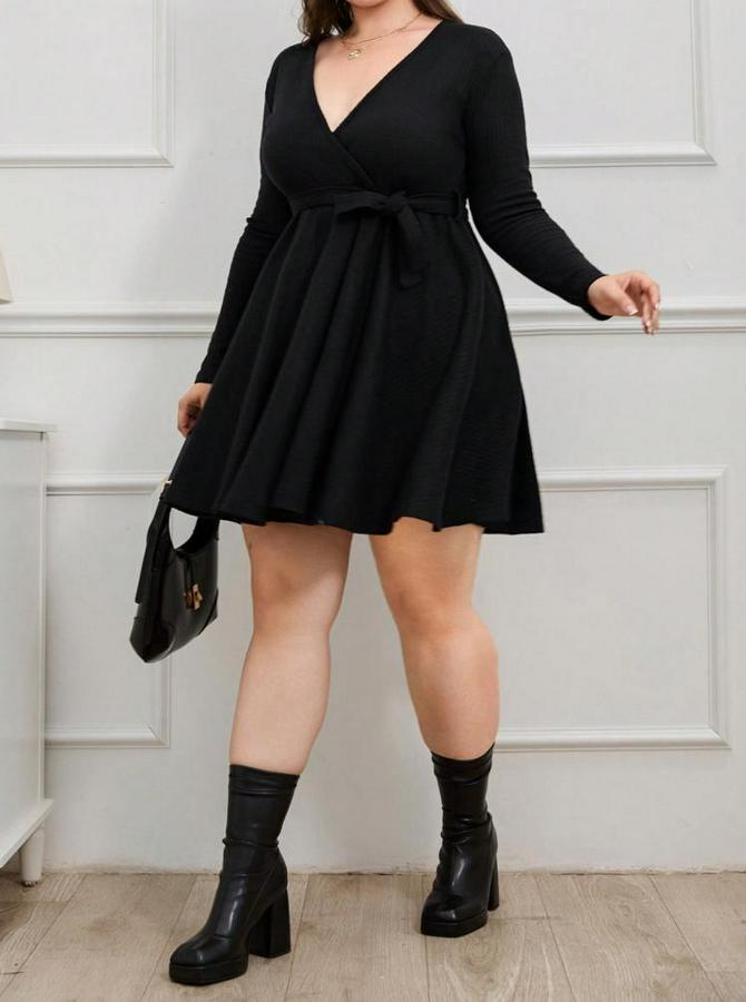 Uzun Kollu Kruvaze Yaka Kuşak Detay Salaş Şardonlu Kaşkorse Mini Elbise