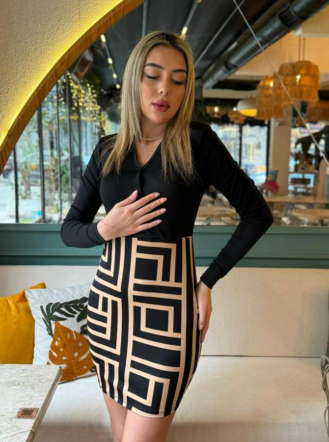 Uzun Kollu Kruvaze Yaka Labirent Desen Dalgıç Elbise