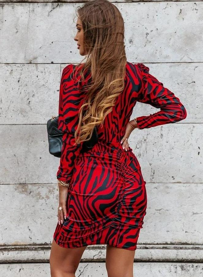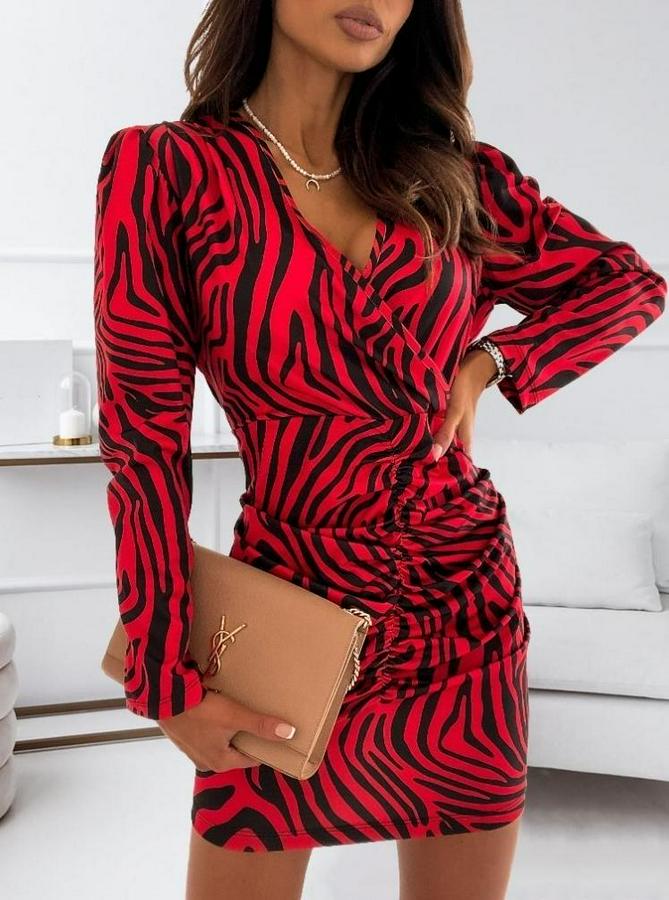AnasayfaTüm ÜrünlerElbiseUzun Kollu Kruvaze Yaka Ön Kısım Büzgülü Zebra Desen Dalgıç Elbise