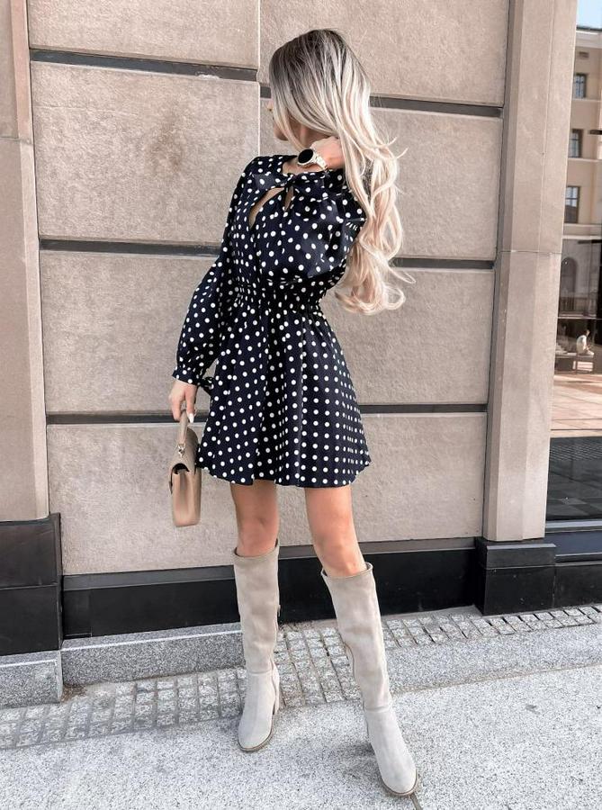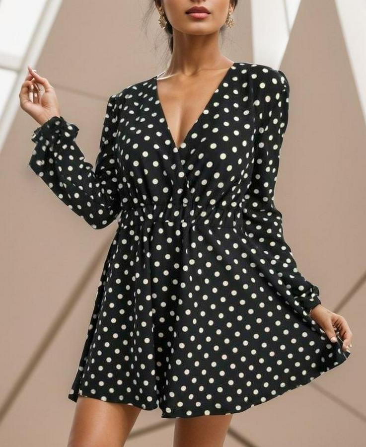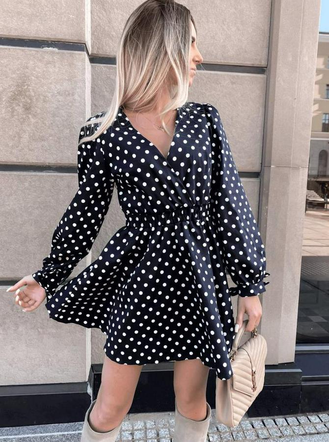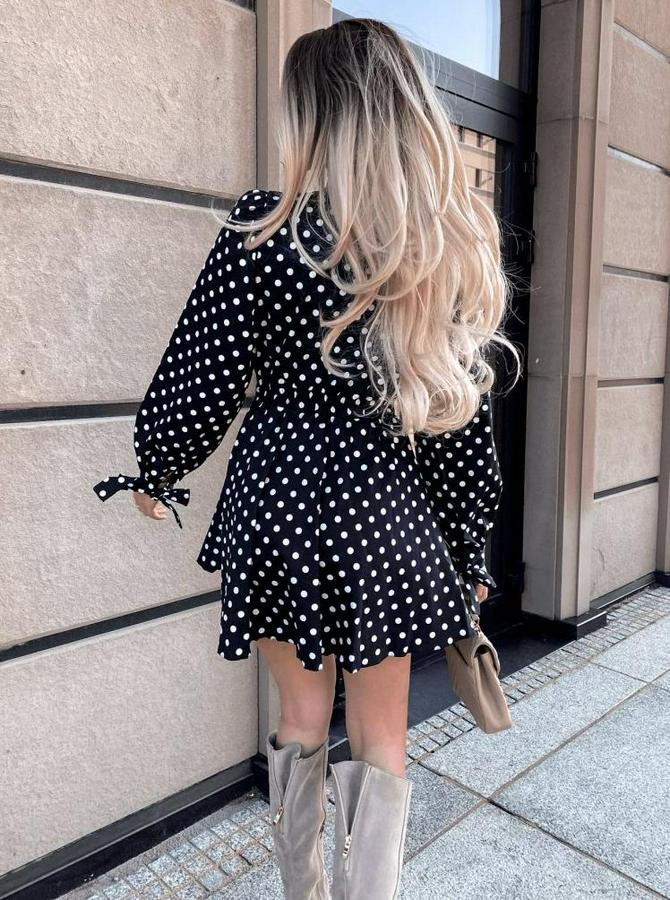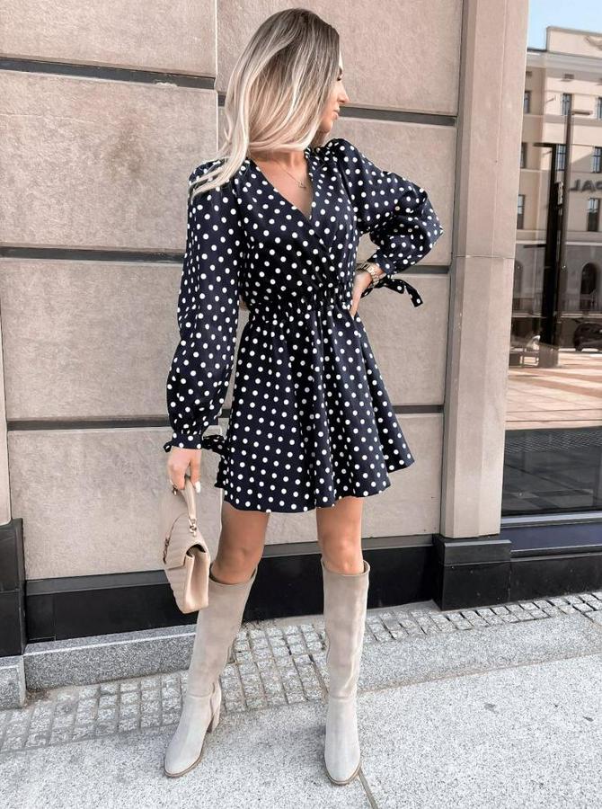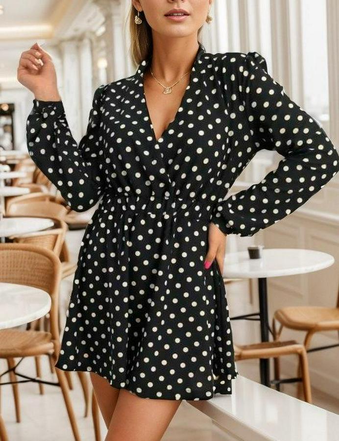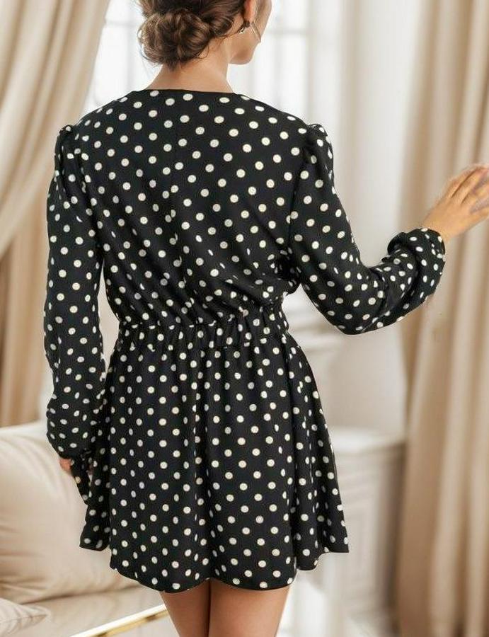 Uzun Kollu Kruvaze Yaka Puantiyeli Desen Krep Mini Boy Elbise