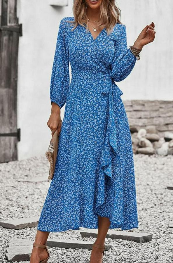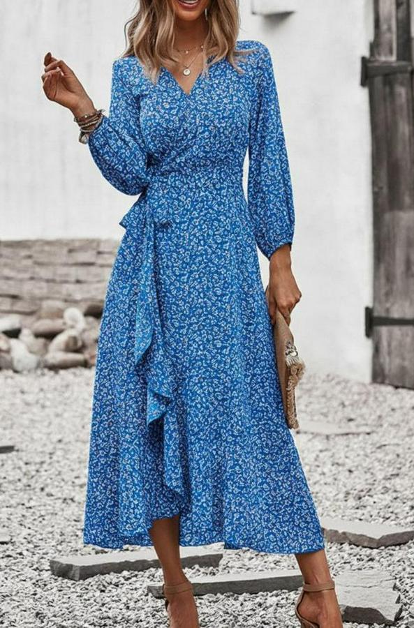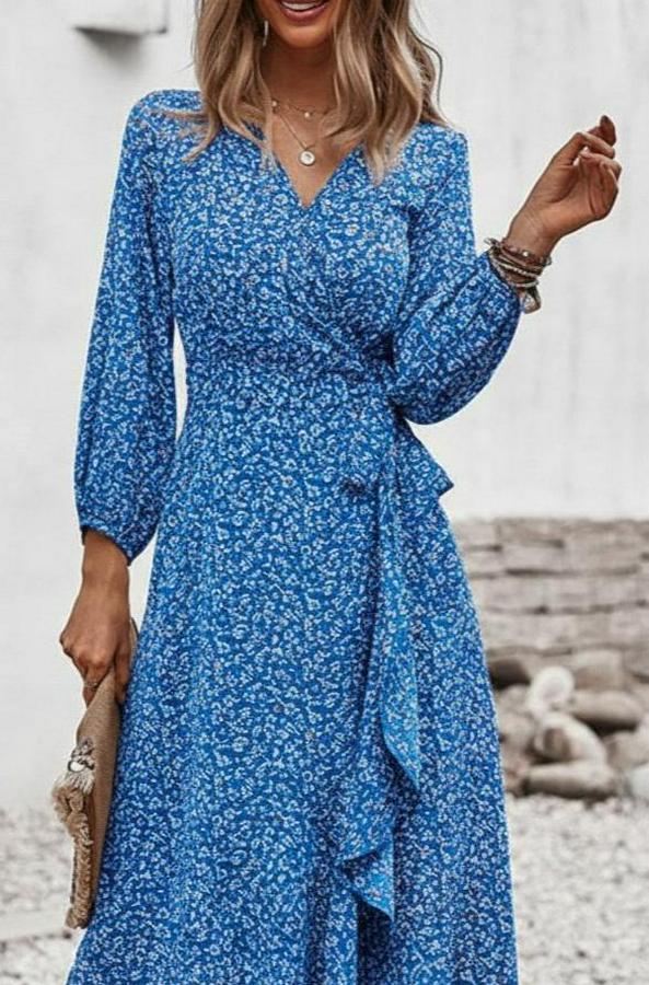 Kadın Uzun Kollu Kruvaze Yaka Yandan Bağlamalı önden Fırfır Detaylı Süprem Uzun Elbise