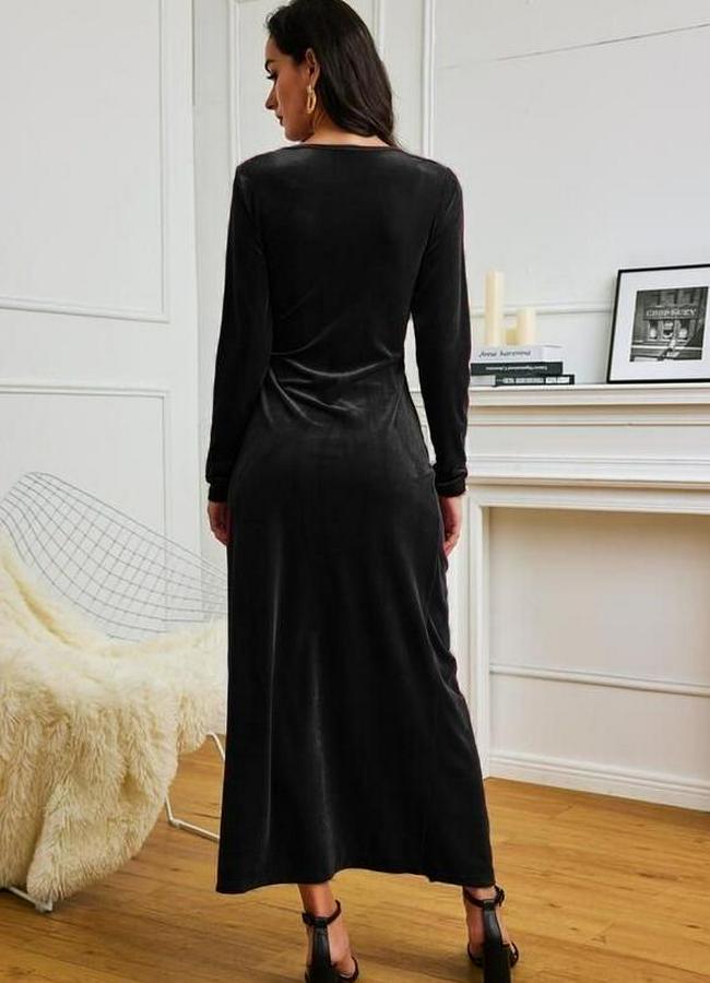 Uzun Kollu Kruvaze Yaka Yırtmaçlı Kadife Elbise