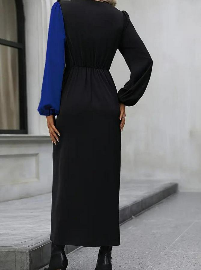 Uzun Kollu Kruvaze Yakalı Belden Çapraz Detaylı Çift Renkli Midi Ithal Krep Elbise