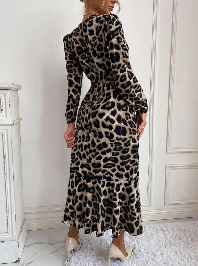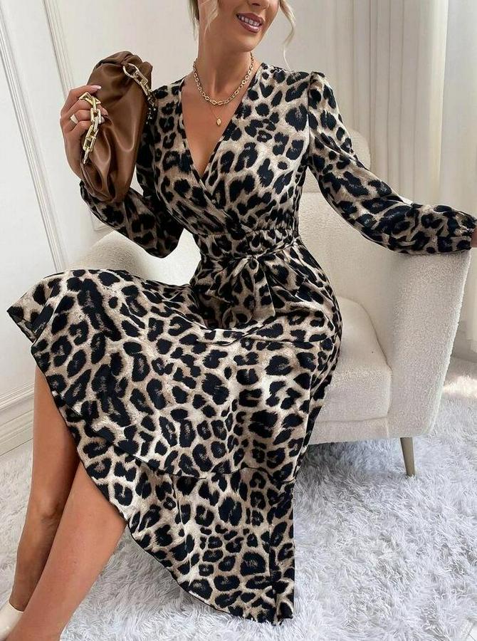 Uzun Kollu Kruvaze Yakalı Belden Kuşaklı Leopar Desenli Elbise